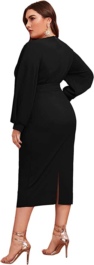 Women's Plus Size V Neck Lantern Sleeve Midi Belted Bodycon Dress